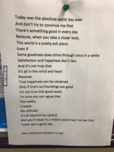 FBに流れて来た文章が面白かったので訳してみた。訳すこと自体パズルっぽくてなかなか楽しかった 今日は本当に最悪だった だから私にこんなふうに思わせようとしても無駄 どんな日も何かいいことはあったはず よく見ると 時には美しく輝いている としても 世…